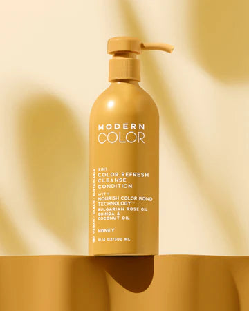 Modern Color’s 3-in-1 Color Refresh + Cleanse + Conditioner instantly infuses semi-permanent honey / strawberry-blonde tone with every wash.